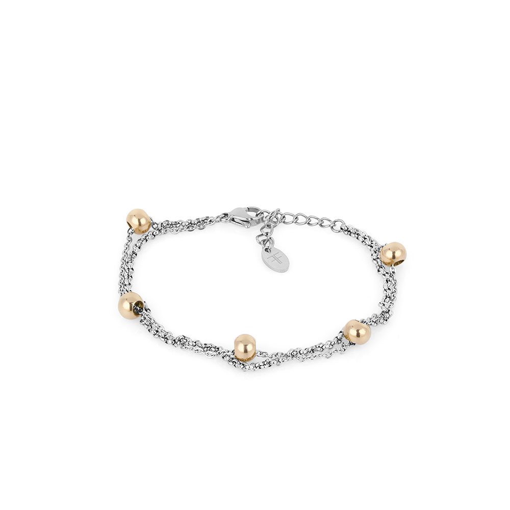 Detaliile fine ale lantului subtire, alaturi de margelele aurii distribuite uniform, confera bratarii un aspect rafinat si feminin. Materialul rezistent la coroziune si zgarieturi garanteaza o durabilitate indelungata, pastrandu-si stralucirea in timp.