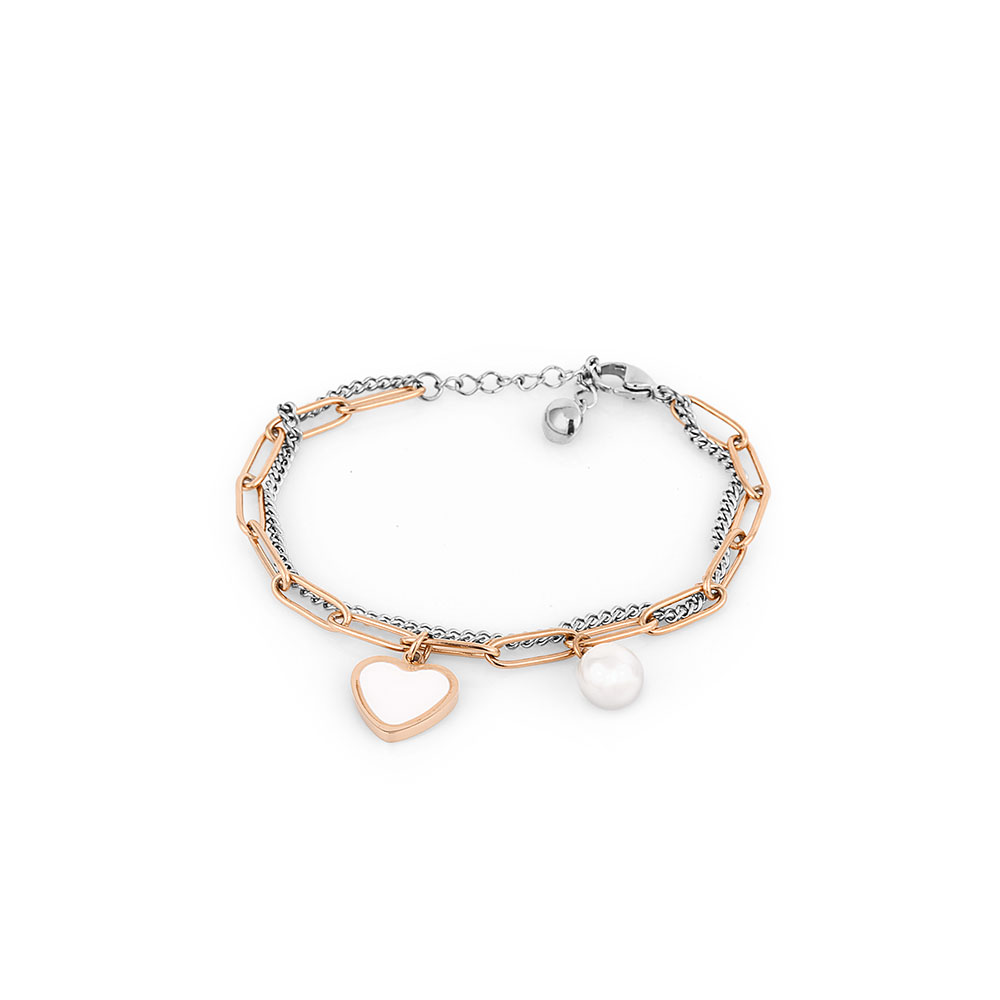 Detaliile rafinate ale acestei bratari includ un pandantiv in forma de inima, simbol al feminitatii si elegantei, alaturi de o perlă delicata, ce adauga un plus de rafinament. Combinatia dintre lantul fin si elementele decorative transforma acest accesoriu intr-o alegere ideala pentru orice ocazie, fie ca este vorba despre o tinuta casual sau una eleganta.