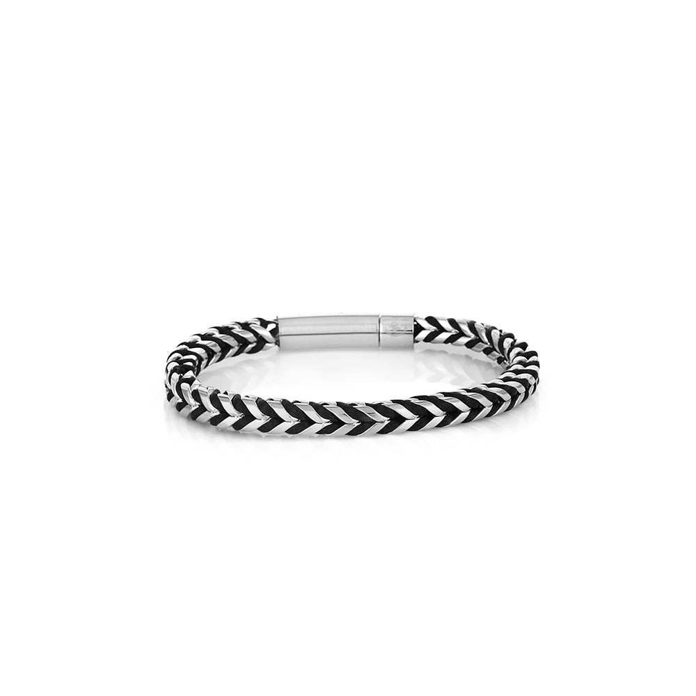 Designul impletit in nuante de argintiu si negru adauga un efect vizual atractiv, potrivit atat pentru tinutele casual, cat si pentru cele elegante. Sistemul de inchidere cu carlig asigura o fixare sigura si confortabila pe incheietura, in timp ce latimea de 6 mm si lungimea de 180 mm ofera o potrivire optima pentru majoritatea barbatilor.