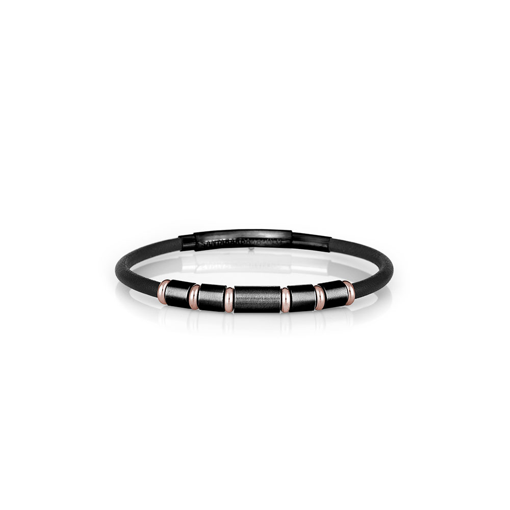 Fabricata din piele naturala neagra si otel inoxidabil auriu rose, aceasta bratara imbina perfect stilul modern cu durabilitatea. Elementele metalice atent finisate adauga un plus de rafinament, facand-o potrivita atat pentru tinutele casual, cat si pentru cele elegante.