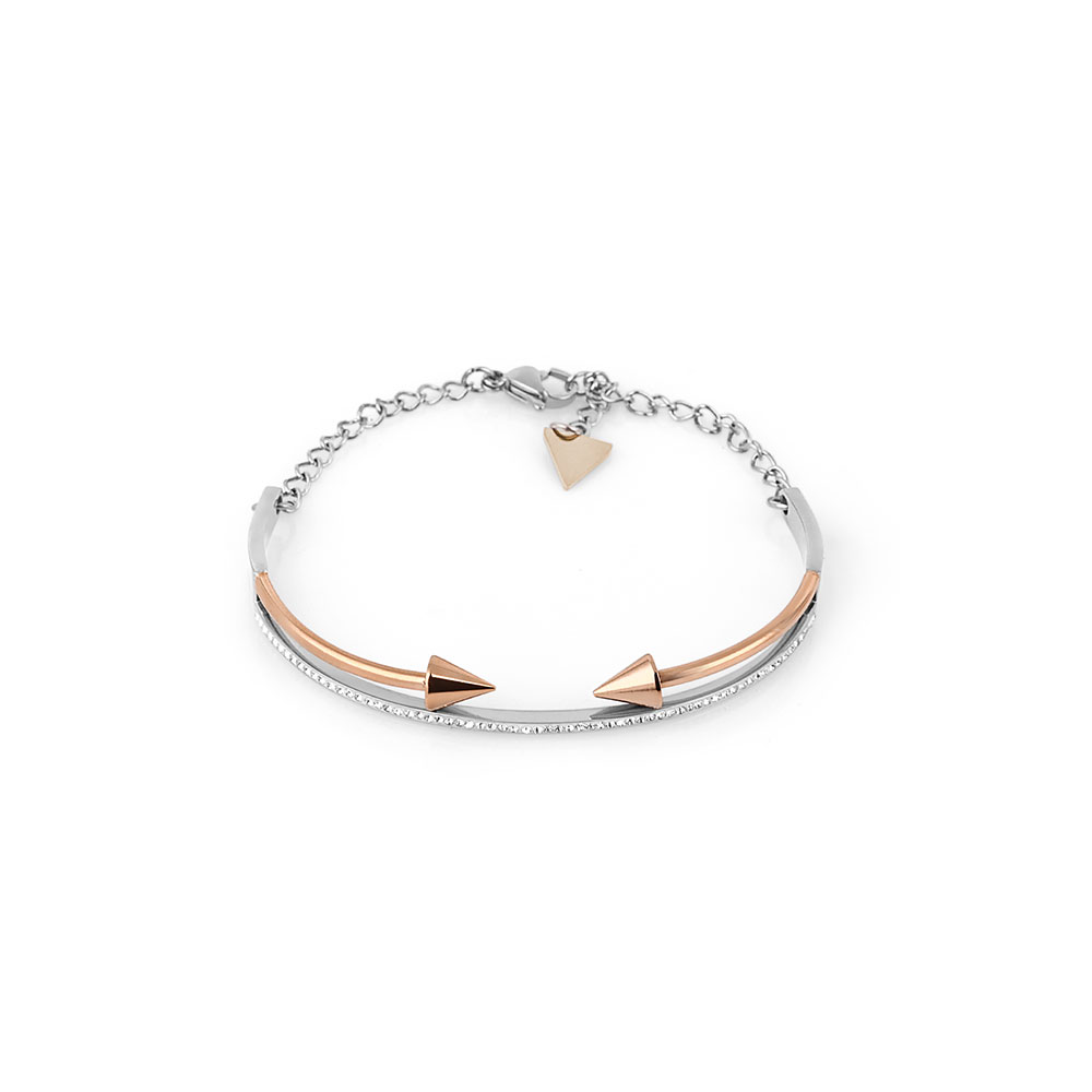 Designul bratarii este definit de doua bare metalice curbate, una in nuanta argintie si cealalta in auriu rose, unite armonios prin detalii minimaliste. Accentele sub forma de varfuri conice in auriu rose adauga un aer contemporan si indraznet. Pe langa estetica deosebita, bratara este decorata cu zirconii stralucitoare, care ofera un plus de stralucire si rafinament.