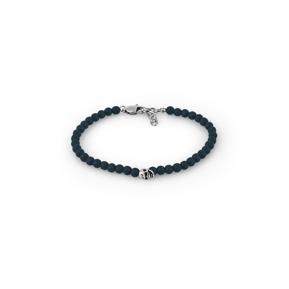Designul este compus din margele bleumarin, ce confera un aspect modern si sofisticat, completate de un detaliu distinctiv in nuanta argintie, ce adauga un contrast subtil si rafinat. Sistemul de inchidere tip carlig asigura o fixare sigura si confortabila pe incheietura.