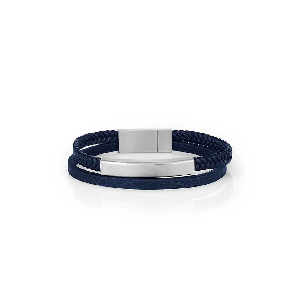 Designul sau unic include doua benzi de piele – una impletita si una neteda – completate de un element central din otel inoxidabil argintiu, ce ofera un contrast elegant si masculin. Sistemul de inchidere magnetic asigura o fixare sigura si confortabila, permitandu-ti sa o porti intreaga zi fara griji.