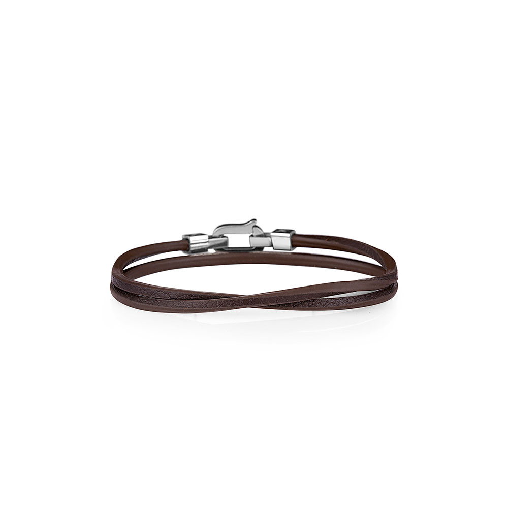 Designul minimalist si modern include doua curele subtiri din piele cafenie, care se intrepatrund subtil pentru un efect vizual distinct. Sistemul de inchidere tip carlig din otel inoxidabil argintiu asigura o fixare sigura si confortabila, fiind usor de utilizat.