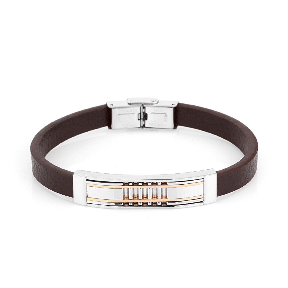 Completeaza-ti stilul cu o bratara masculina eleganta si moderna, semnata Santa Barbara Polo. Aceasta bratara imbina armonios pielea naturala cafenie cu un element central din otel inoxidabil in nuante argintiu si auriu, oferind un contrast sofisticat si o nota distincta de rafinament.