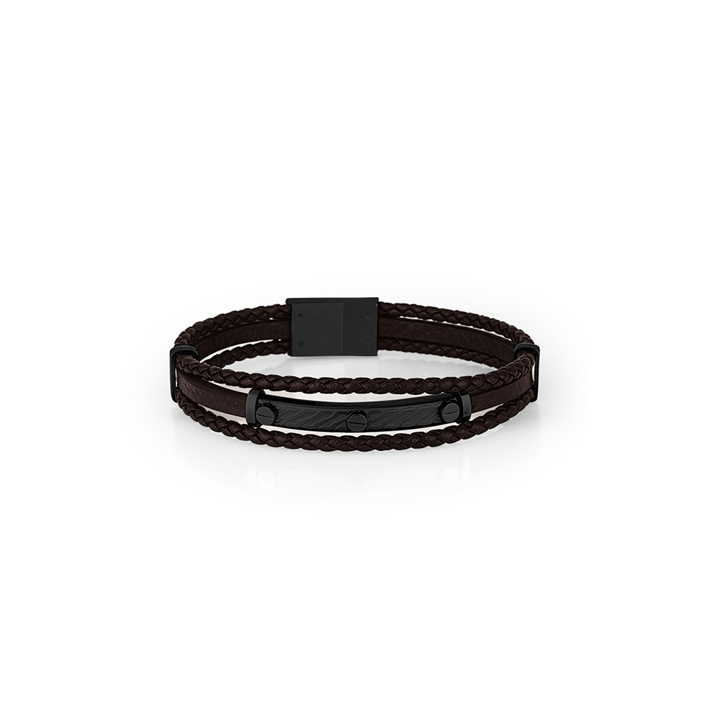 Bratara este compusa din mai multe benzi din piele cafenie impletita, completate de detalii metalice in nuanta negru mat, oferindu-i un aspect rafinat si contemporan. Sistemul de inchidere magnetic asigura o fixare sigura si confortabila, permitandu-ti sa o porti intreaga zi fara griji.