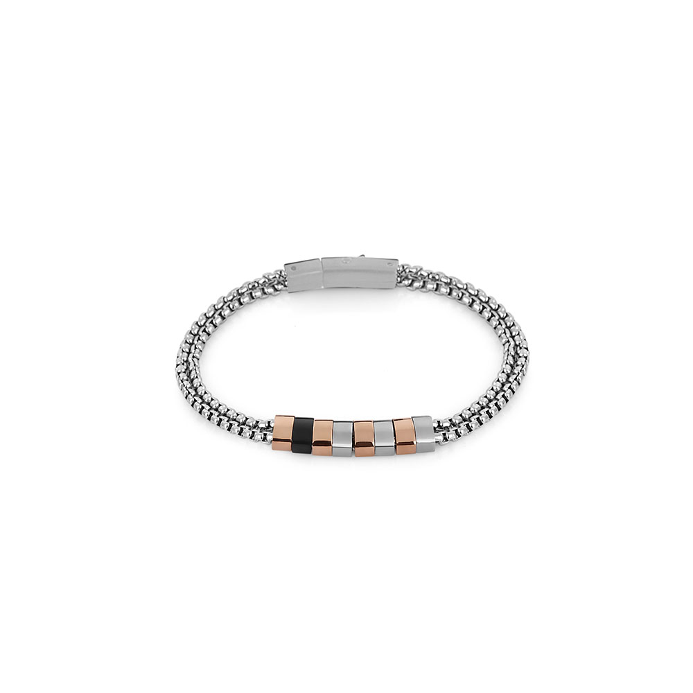 Fabricata din otel inoxidabil de inalta calitate, bratara asigura o rezistenta excelenta la uzura si coroziune, pastrandu-si aspectul impecabil in timp. Modelul este alcatuit dintr-un lant dublu impletit, completat de elemente geometrice metalice in tonuri contrastante, conferindu-i un aer distinct si masculin.