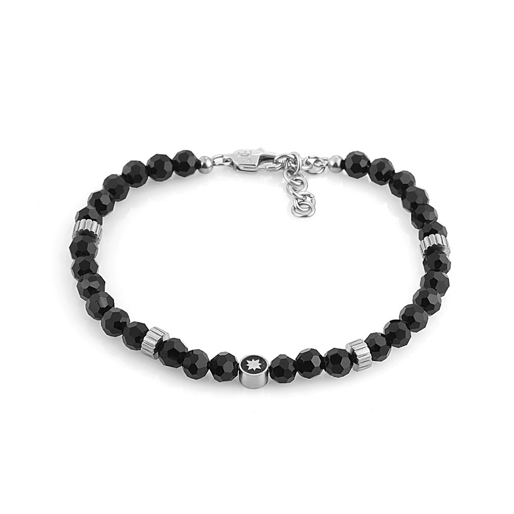 Bratara este alcatuita din margele negre fatetate, care capteaza lumina subtil, oferind un efect sofisticat. Elementele argintii din otel inoxidabil adauga un contrast elegant si un plus de rezistenta in timp. Sistemul de inchidere tip carlig asigura o fixare sigura si confortabila, permitand ajustarea lungimii pentru o potrivire perfecta.