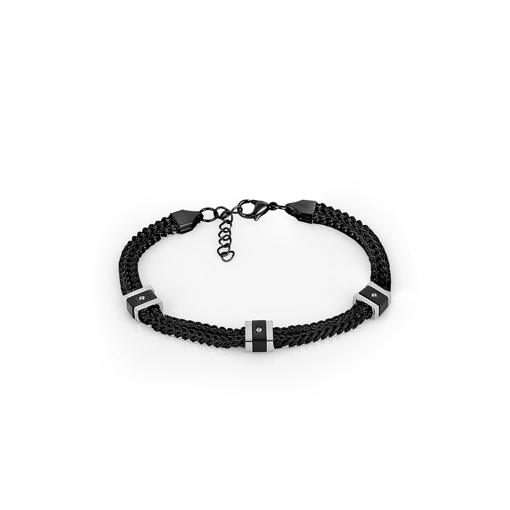 Modelul este compus dintr-un lant impletit negru, decorat cu elemente argintii si accente din zirconii, adaugand un plus de stralucire subtila. Cu o lungime de 200 mm si o latime de 5 mm, bratara este confortabila la purtare si se potriveste perfect oricarei incheieturi datorita sistemului de inchidere cu carlig, asigurand o fixare sigura.