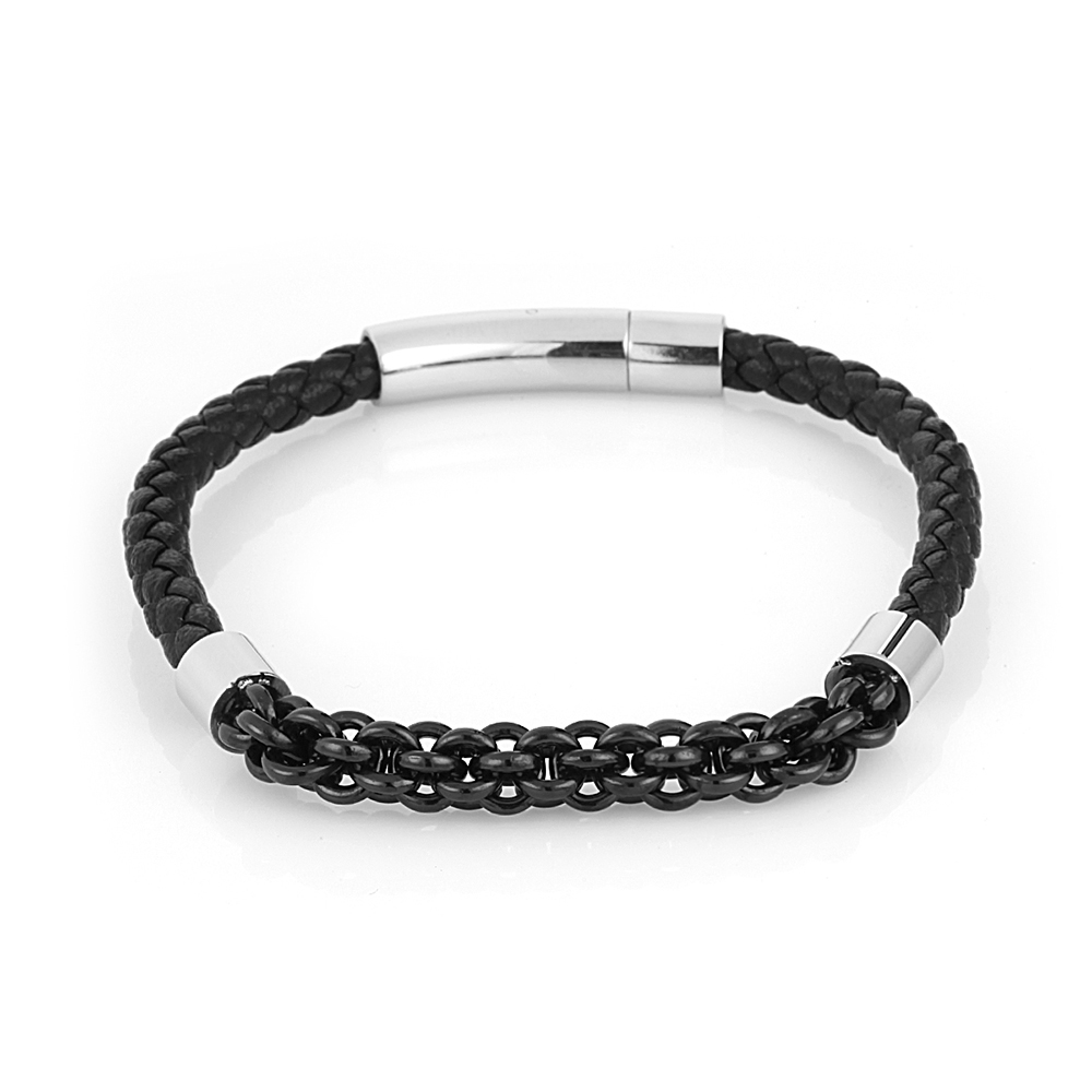 Designul bratarii se remarca printr-o combinatie echilibrata intre pielea neagra impletita si lantul metalic negru, accentuat de detalii argintii. Aceste elemente confera un aspect urban, potrivit atat pentru tinutele casual, cat si pentru cele elegante.