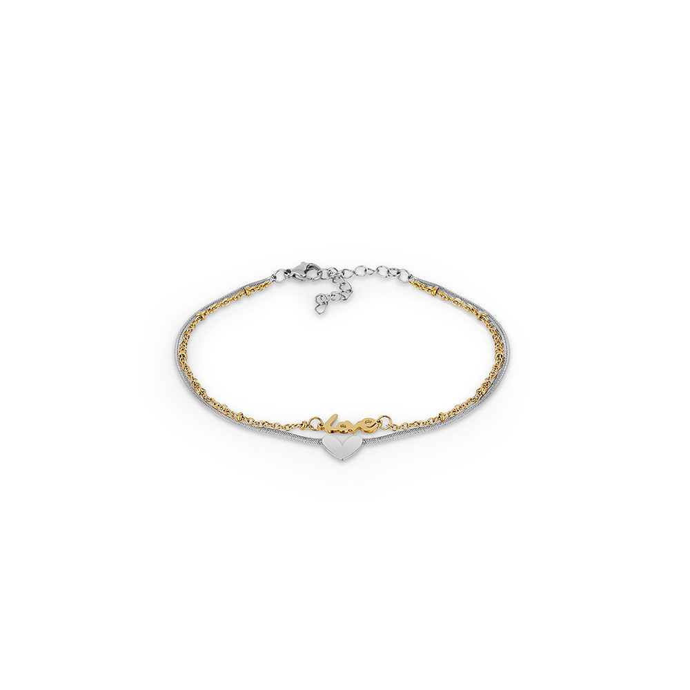 Designul sau rafinat este completat de un pandantiv in forma de inima si inscriptia 'love', simbolizand iubirea si feminitatea. Cele doua lantisoare subtiri, unul impletit si celalalt neted, creeaza un contrast placut si un efect vizual unic.
