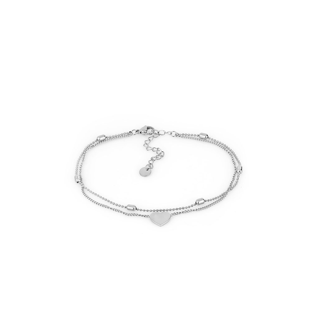 Designul delicat al bratarii imbina doua lantisoare subtiri, decorate cu elemente metalice discrete si un pandantiv in forma de inima, simbol al elegantei si feminitatii. Cu o lungime ajustabila de 260 mm, aceasta bratara se potriveste perfect oricarei glezne, oferind confort si siguranta datorita sistemului de inchidere tip carlig.