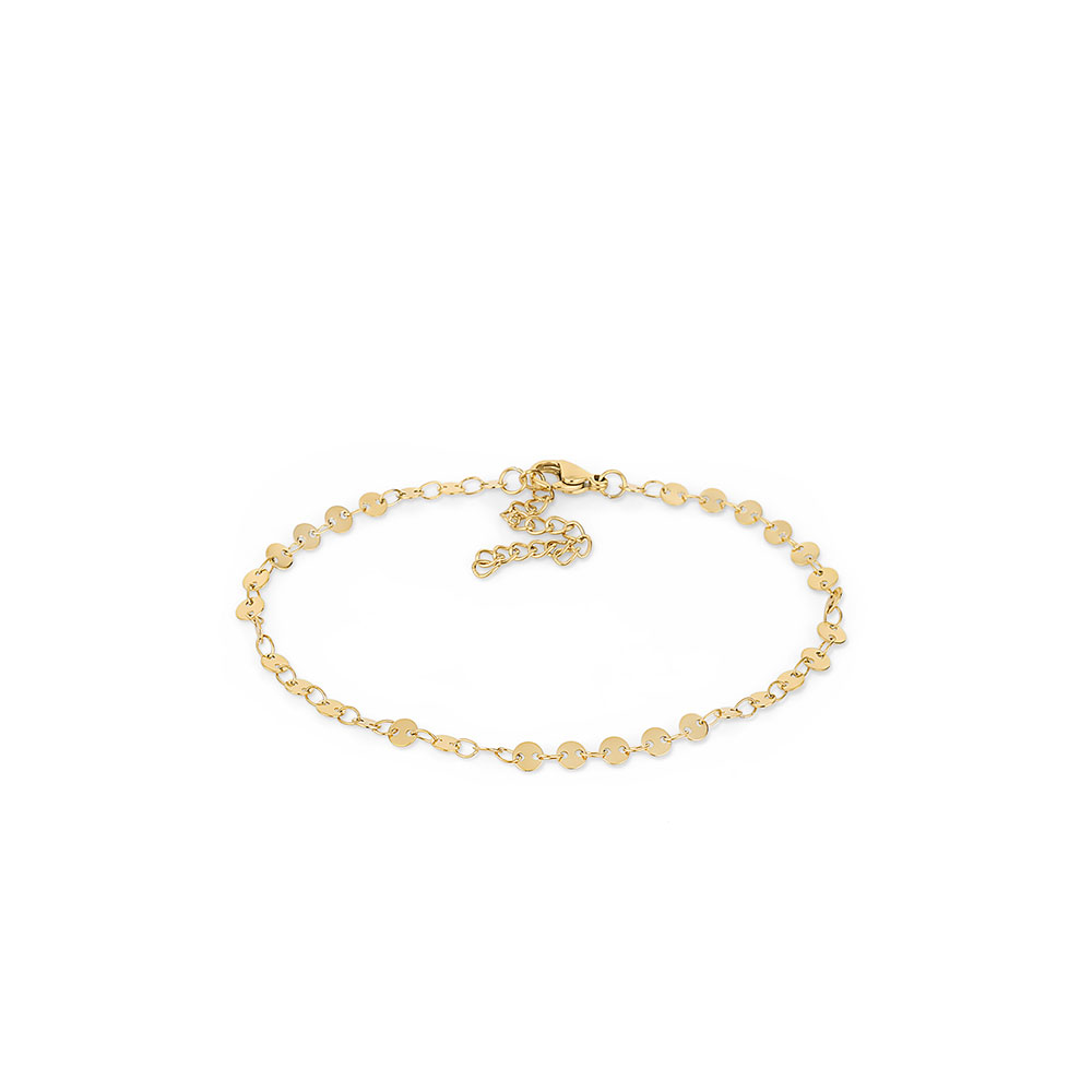 Designul delicat al bratarii se evidentiaza printr-un lant fin decorat cu elemente rotunde aurii, ce creeaza un efect subtil de stralucire la fiecare miscare. Cu o lungime ajustabila de 260 mm si un sistem de inchidere tip carlig, aceasta bratara se potriveste perfect oricarei glezne, asigurand confort si siguranta in purtare.