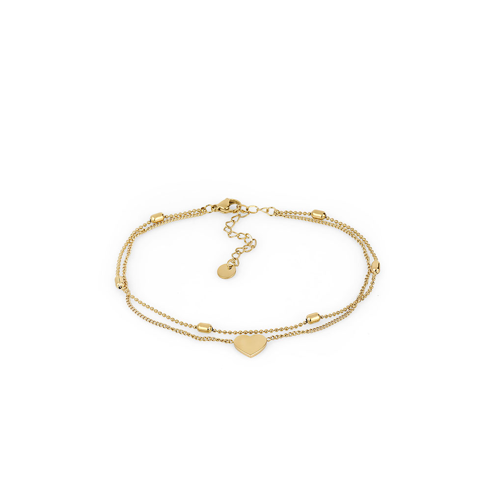 Designul sau delicat imbina doua lantisoare subtiri, decorate cu elemente metalice discrete si un pandantiv in forma de inima, conferind un plus de feminitate si eleganta. Culoarea aurie adauga un aer sofisticat, perfect pentru a fi purtata atat in tinute casual, cat si in ocazii speciale.