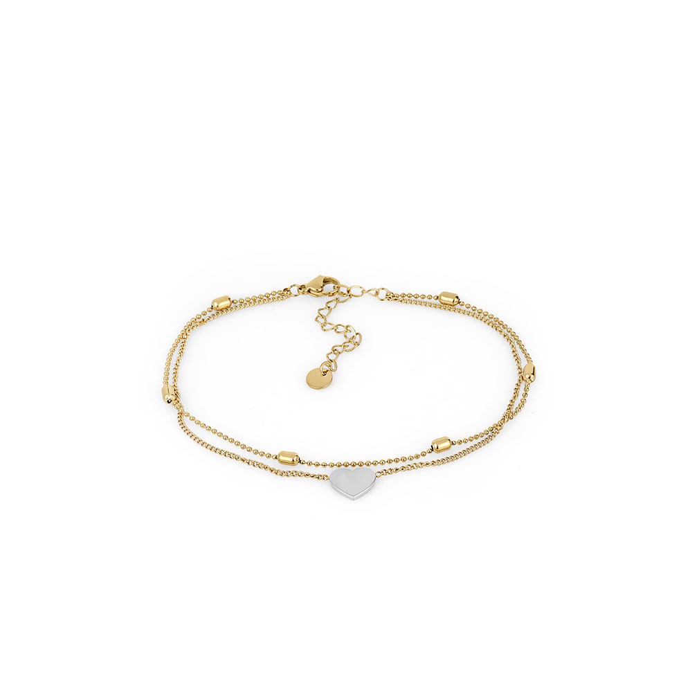 Fabricata din otel inoxidabil, acest accesoriu este durabil, rezistent la uzura si isi pastreaza stralucirea timp indelungat. Bratara dispune de un lant dublu delicat, decorat cu margele aurii si un pandantiv in forma de inima argintie, oferind un contrast subtil si elegant.