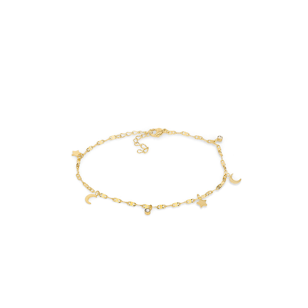 Designul delicat este completat de charm-uri elegante in forma de stea si luna, oferind un aspect modern si feminin. Nuanta aurie adauga un aer luxos, fiind usor de asortat cu alte bijuterii sau accesorii.
