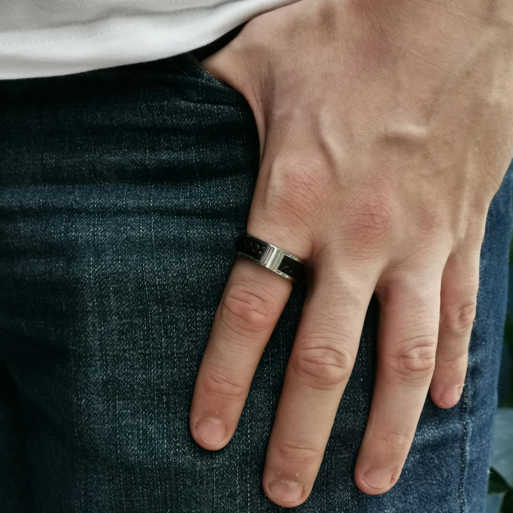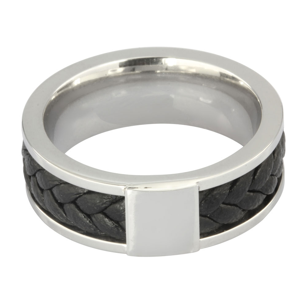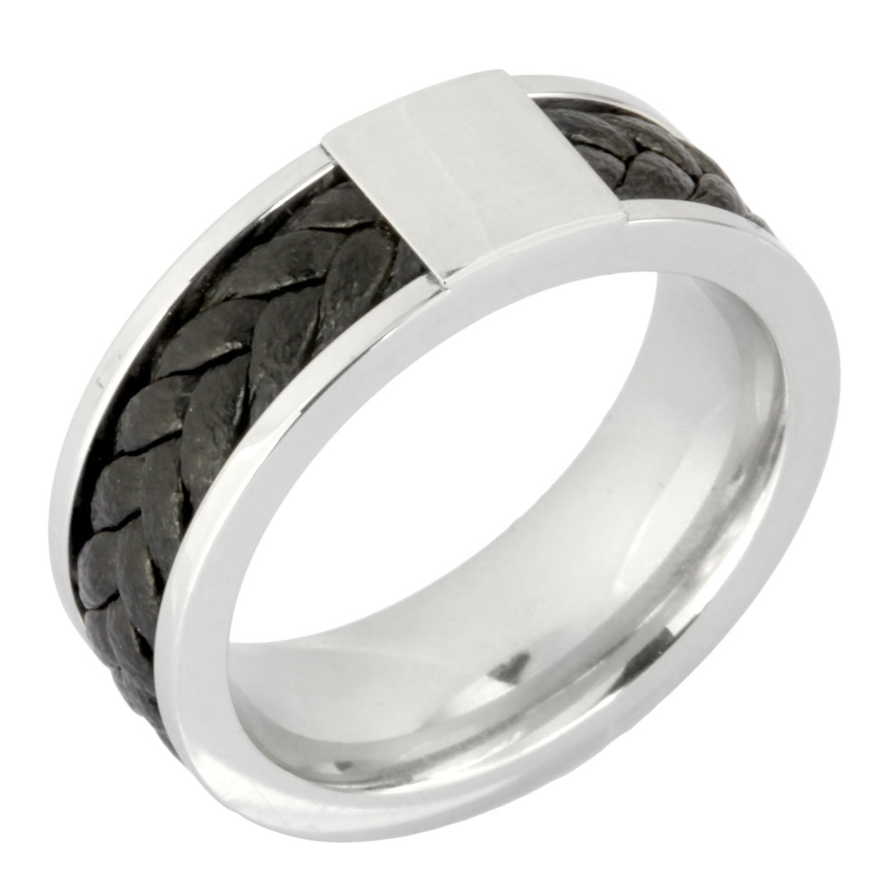 Inel barbatesc din otel inoxidabil, cu insertie impletita din piele. Marime inel 58 - circumferinta 58 mm. ( vezi aici ghid marime inel )