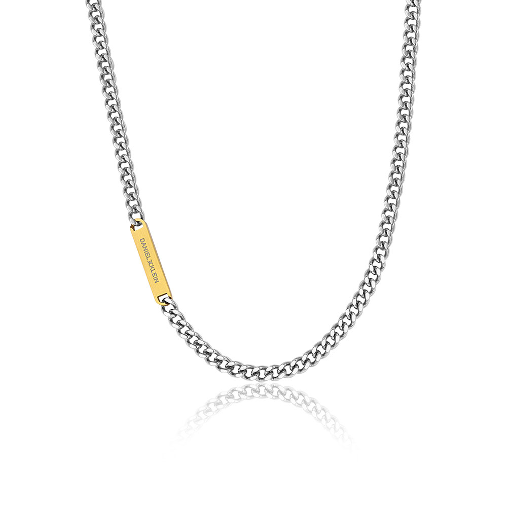 Lantul are o lungime de 49 cm si o latime de 5 mm, dimensiuni ideale pentru a se potrivi oricarei tinute, fie casual, fie eleganta. Elementul distinctiv al acestui model este placuta aurie inscriptionata cu logo-ul Daniel Klein, care adauga un contrast sofisticat fata de nuanta argintie predominanta.