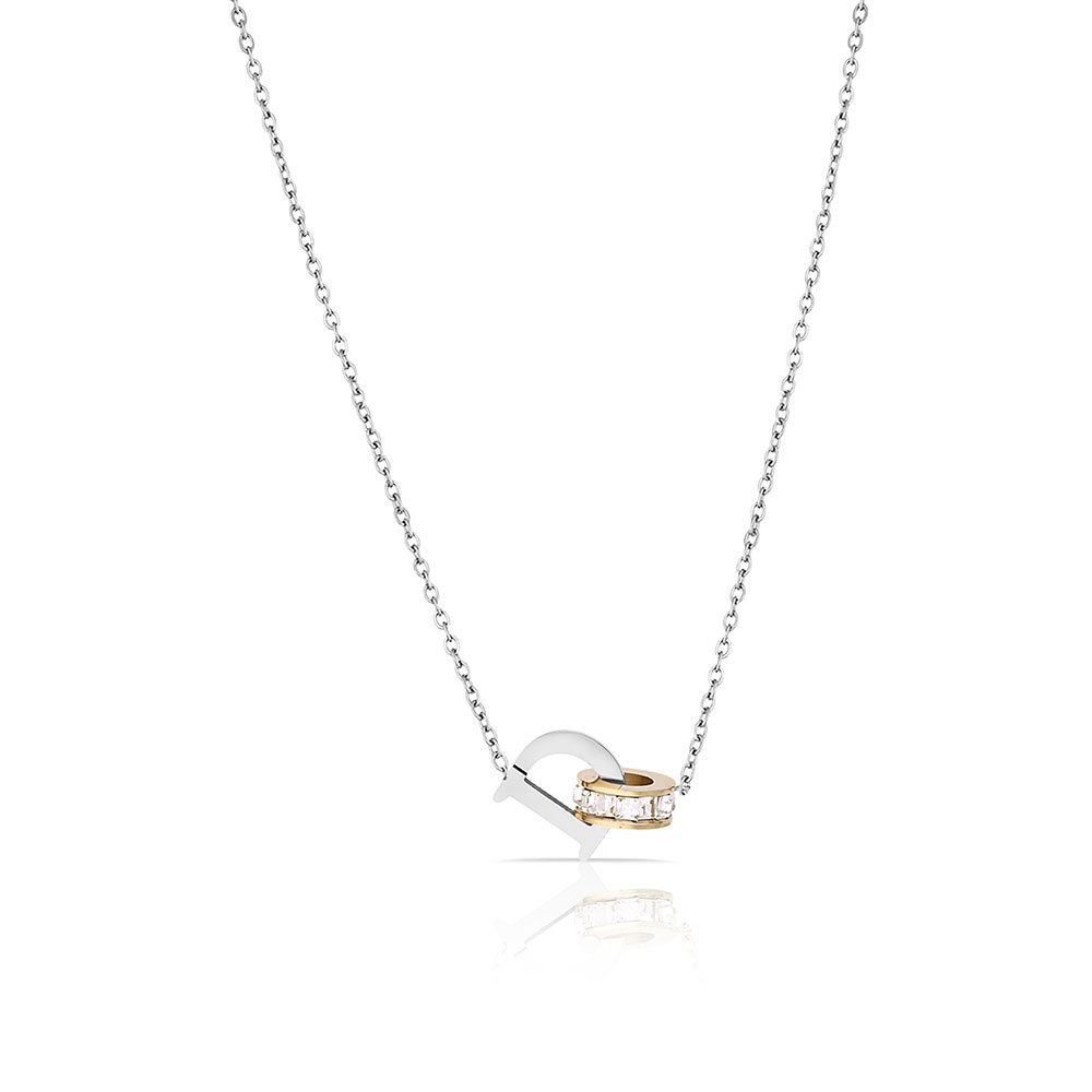 Designul acestui lant argintiu este accentuat de un pandantiv sofisticat, format dintr-un inel auriu decorat cu zirconii stralucitoare, care adauga un plus de rafinament. Contrastul dintre argintiu si auriu ofera un aspect modern si versatil, potrivit atat pentru tinutele de zi cu zi, cat si pentru evenimente speciale.