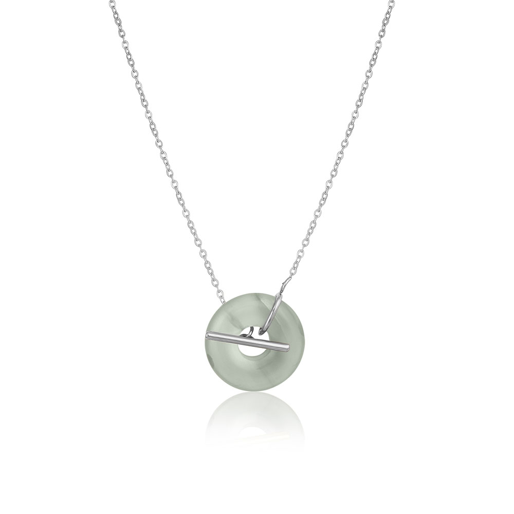 Completeaza-ti tinuta cu un lant elegant din otel inoxidabil, marca Santa Barbara Polo, creat special pentru femeile care apreciaza rafinamentul si calitatea. Acest lant argintiu se remarca printr-un design modern si un pandantiv unic, format dintr-un inel translucid cu nuante de verde pal si un element metalic sofisticat.