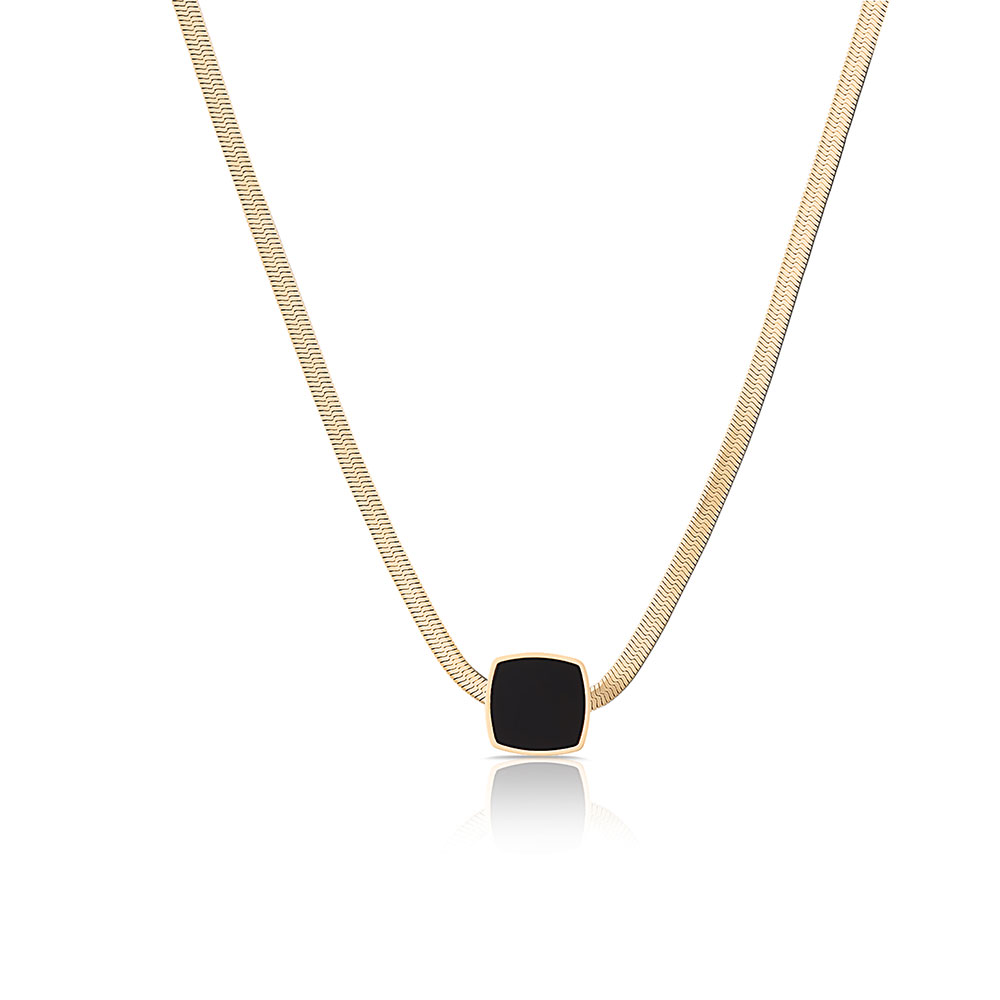 Lantul are o lungime de 390 mm si o latime de 3 mm, oferind un echilibru perfect intre subtilitate si vizibilitate. Elementul central al bijuteriei este un pandantiv patrat, cu margini aurii si un interior negru emailat, care adauga un contrast elegant si versatil.