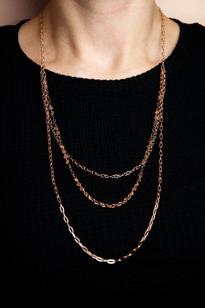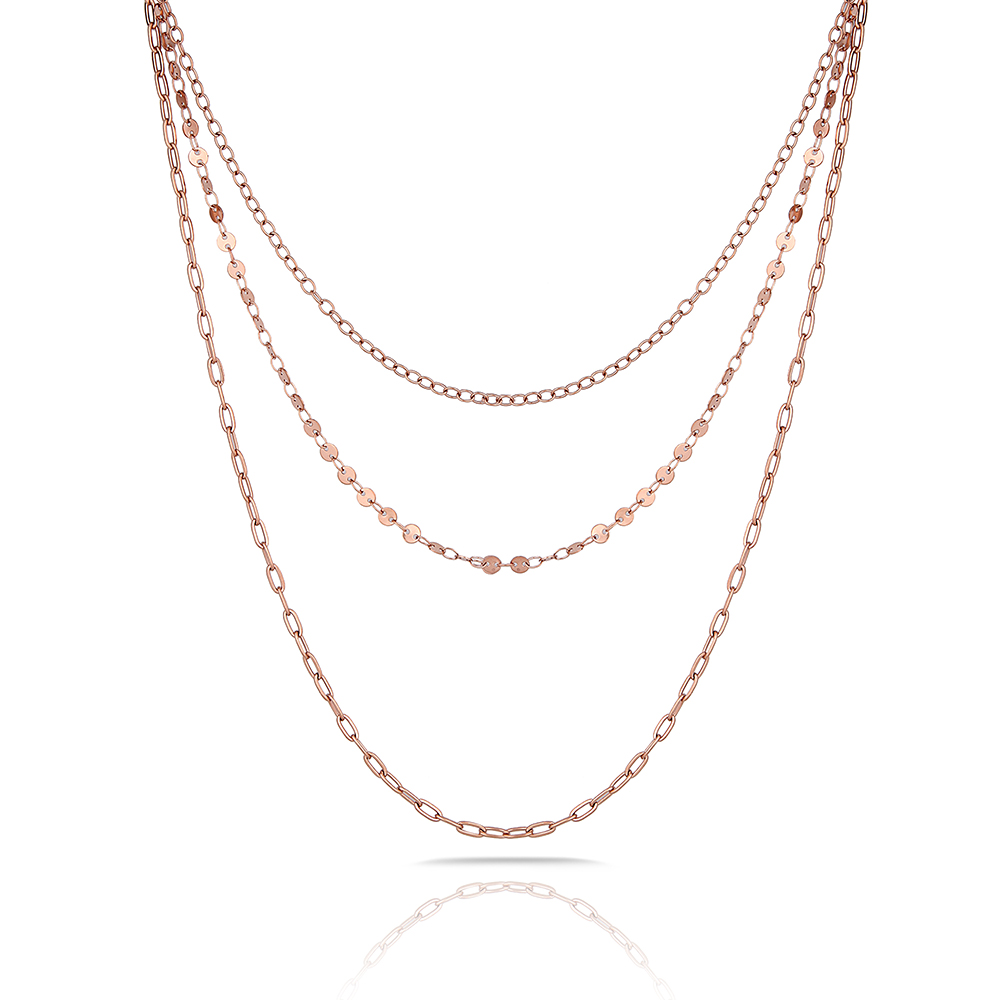 Designul sau modern include trei siraguri cu diferite tipuri de zale si insertii subtile de elemente metalice, oferind un aspect stratificat si versatil. Nuanta calda de auriu rose adauga o nota delicata si feminina, potrivindu-se perfect atat tinutelor casual, cat si celor elegante.