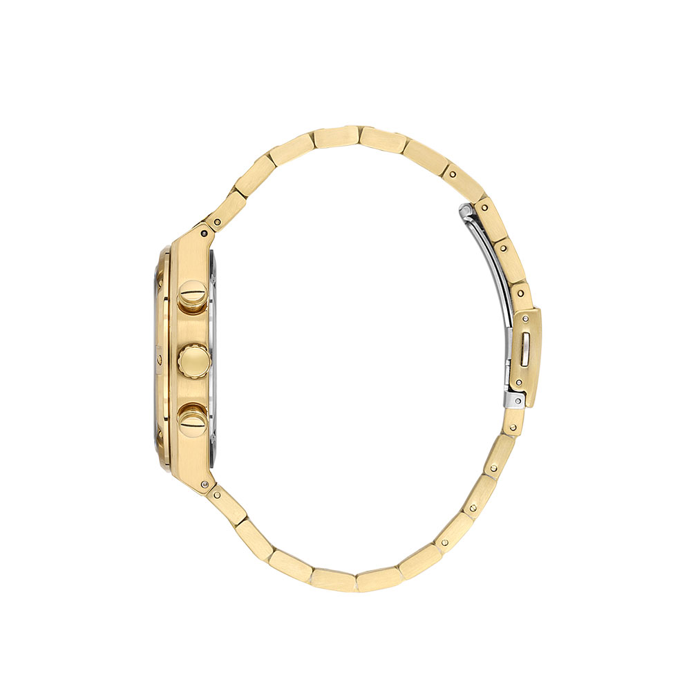Parte din colectia exclusivista Legend, acest model casual se remarca prin designul sau atragator si functiile sale avansate. Carcasa rotunda din otel inoxidabil auriu de 44 mm, impreuna cu bratara eleganta aurie, ofera o estetica premium ce atrage privirile. Cadranul negru, protejat de un geam din cristal mineral, confera o vizibilitate clara si un contrast puternic, subliniind eleganta si stilul masculin.