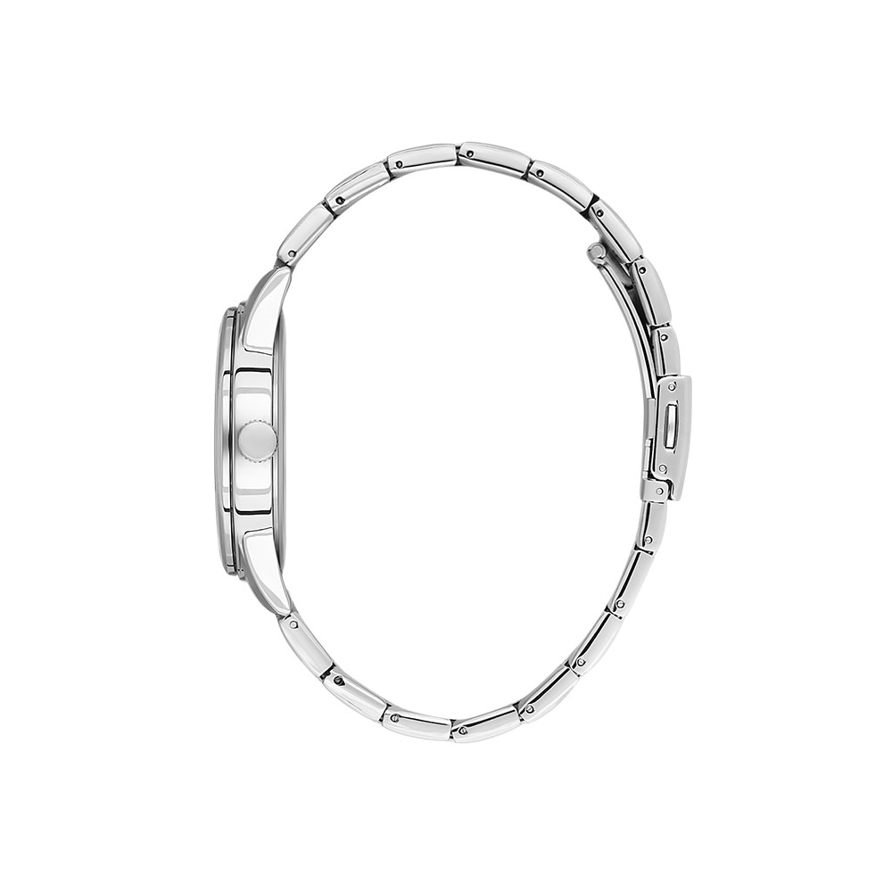 Bratara din otel inoxidabil de culoare argintie nu doar ca adauga durabilitate, dar ofera si un confort sporit pe incheietura, fiind usor de ajustat la lungimea de 210 mm.