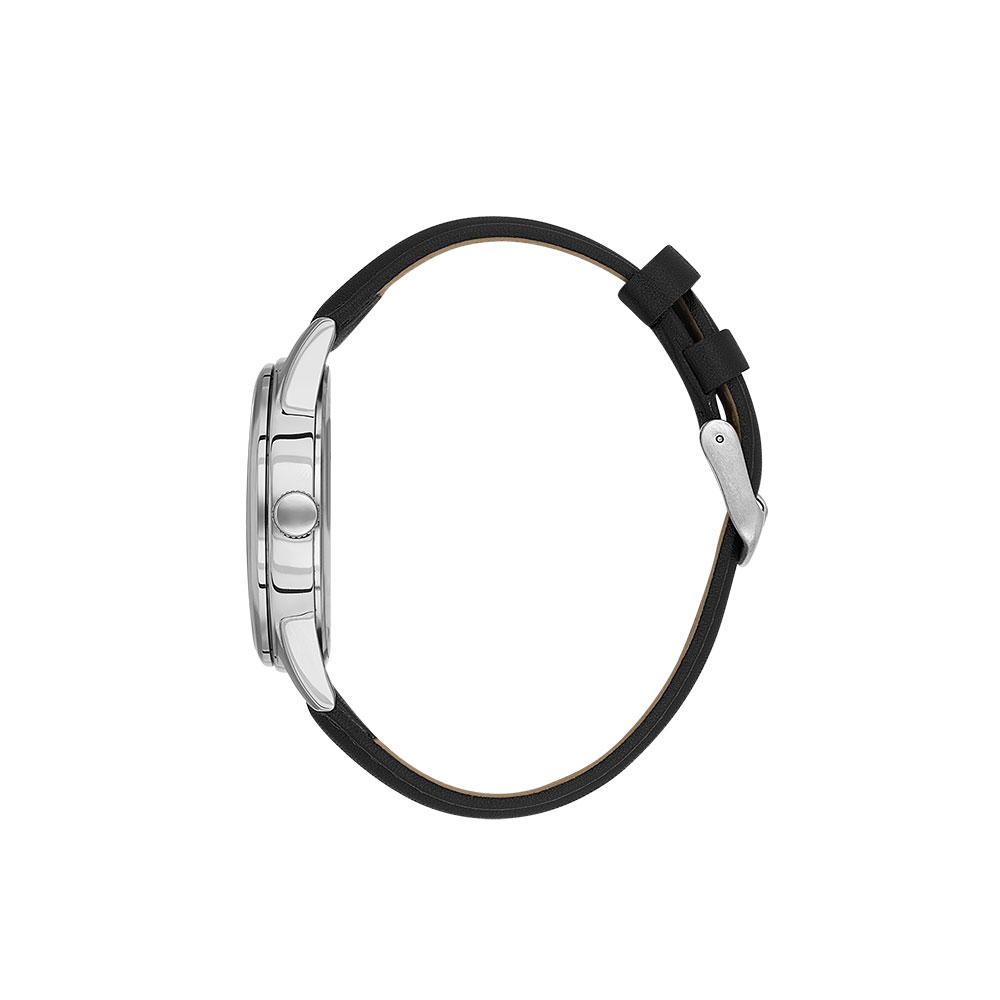 Designul este completat de o curea din piele neagra, confortabila si durabila, cu catarama simpla pentru o ajustare perfecta. Carcasa din aliaj metalic argintiu si forma rotunda a ceasului adauga un plus de rafinament, facandu-l potrivit pentru orice tinuta, de la cea casual la cea business.