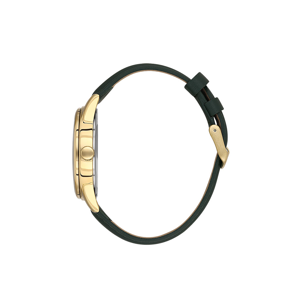 Carcasa rotunda de 41 mm, realizata din aliaj metalic cu finisaj auriu, este completata de un cadran verde intens ce ofera o citire clara a orei, inclusiv o functie practica de afisare a datei. Geamul din cristal mineral rezistent la zgarieturi protejeaza cadranul elegant, asigurand durabilitate si vizibilitate.