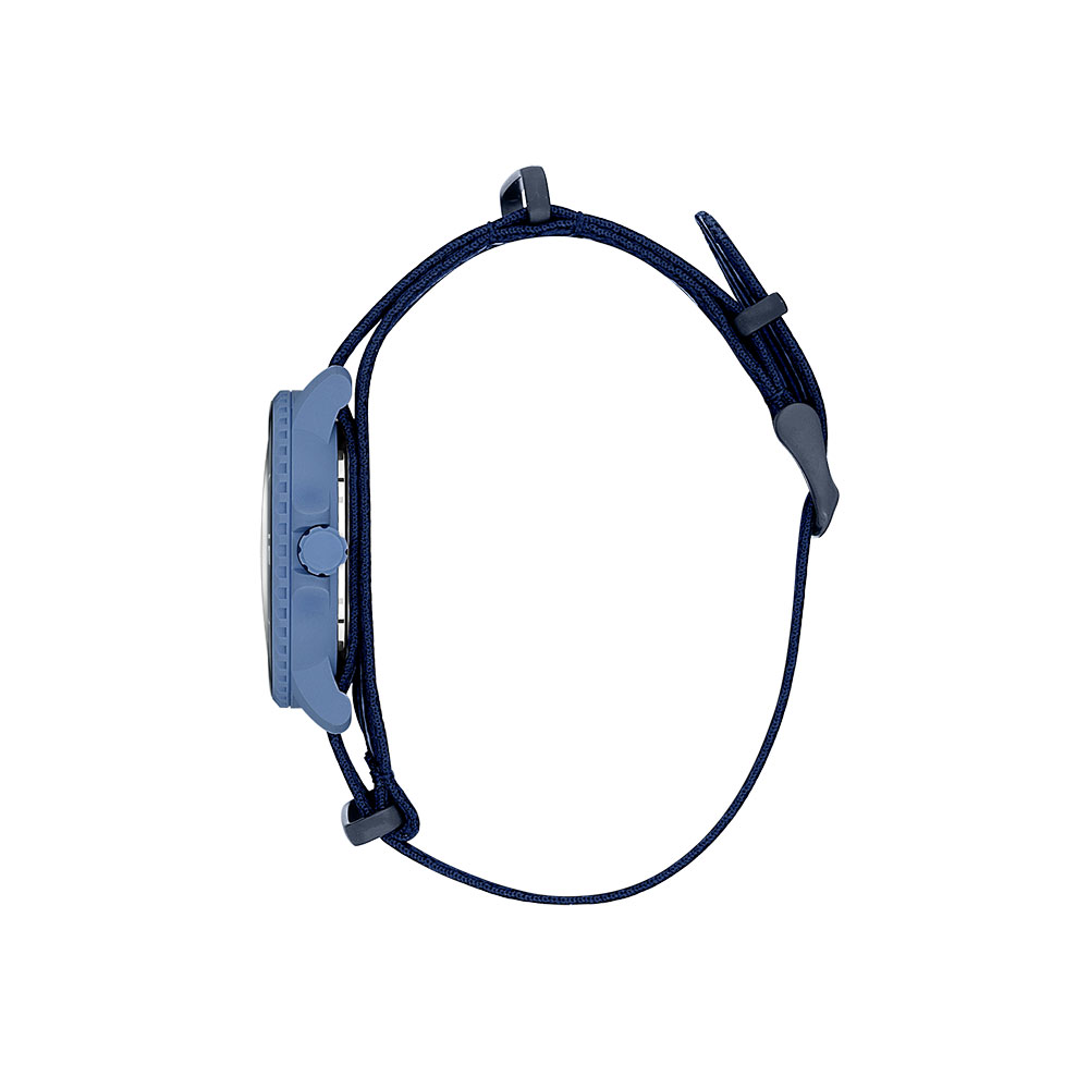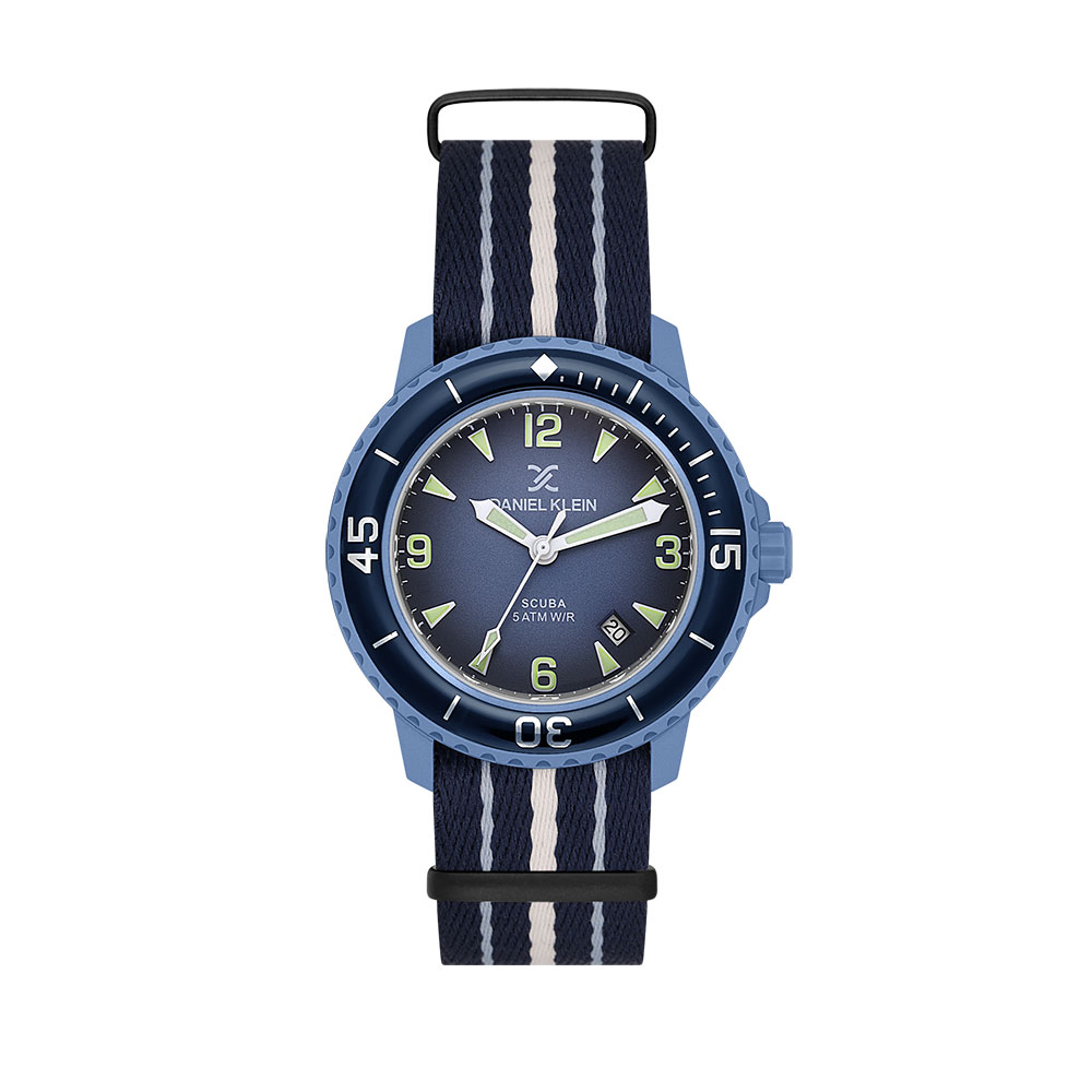 Bratara textila in dungi bleumarin, alb si gri adauga un plus de stil si adaptabilitate, fiind prevazuta cu sistem de inchidere tip catarama pentru siguranta. Mecanismul japonez Quartz Miyota 2115 asigura o precizie excelenta, cu o abatere de doar ±20 secunde/luna. Ceasul include si functie de afisare a datei, utila in activitatile zilnice.