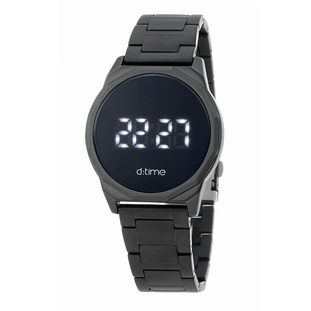 Ceas cu display touch screen; geam cu suprafata bombata si fatetata; carcasa cu bezel decorativ poligonal; bratara tip zale, cu inchizatoare tip fluture; afiseaza data curenta si ora in format 12/24; functie calendar automata.
