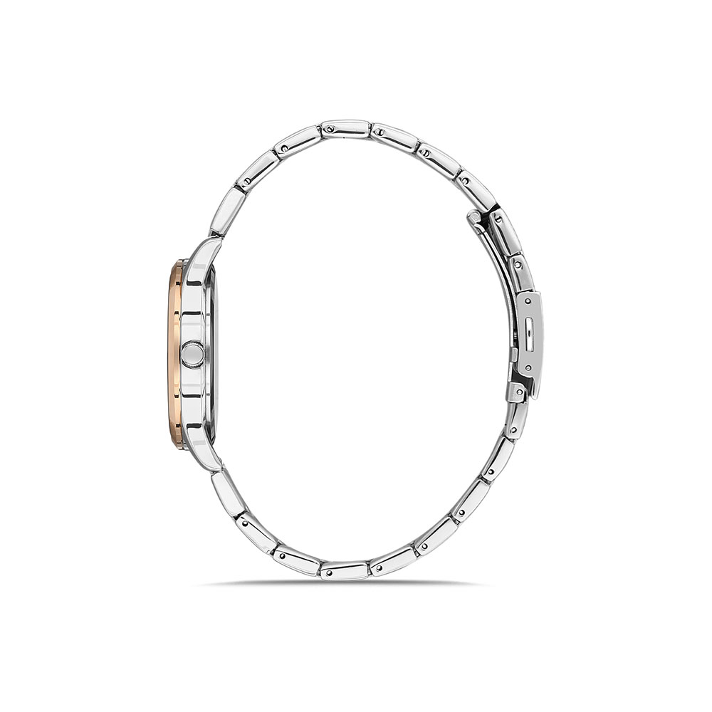 Indicatoarele sunt de tip linii aurii rose, perfect asortate cu marginea cadranului si cu aratatoarele.