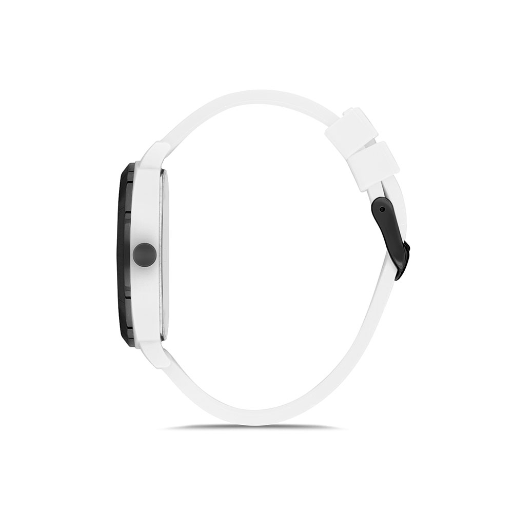 Carcasa alba, cu bezel decorativ negru; afiseaza data curenta.