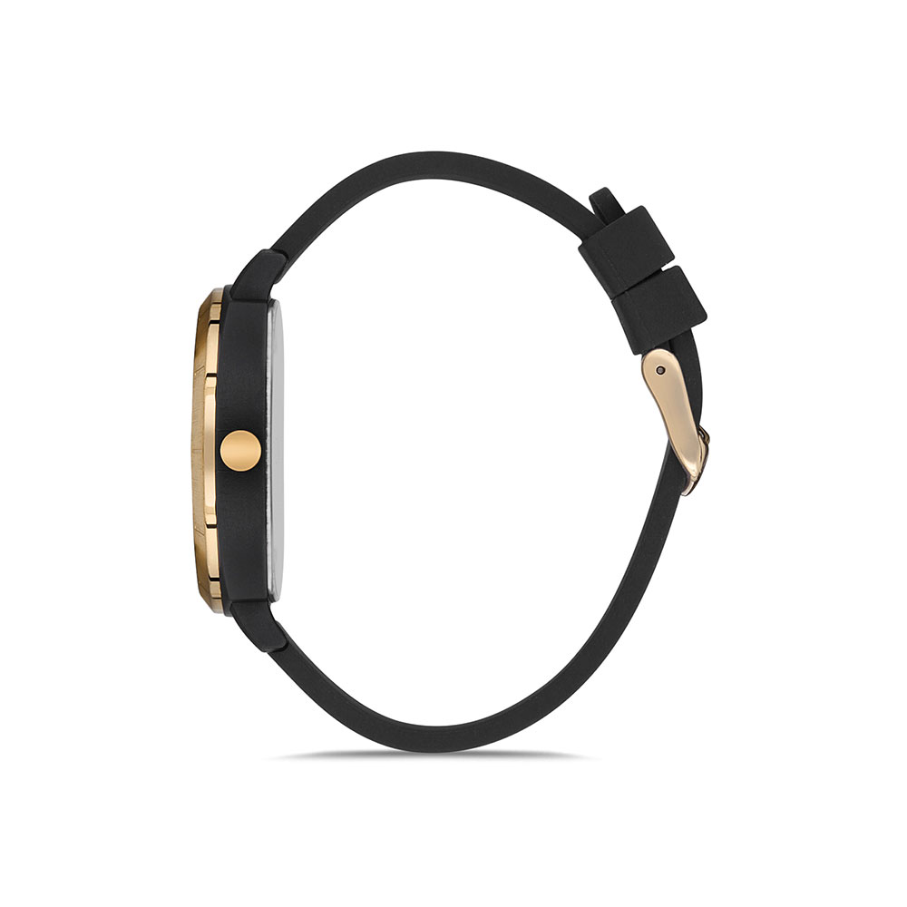 Carcasa neagra, cu bezel decorativ auriu; afiseaza data curenta.