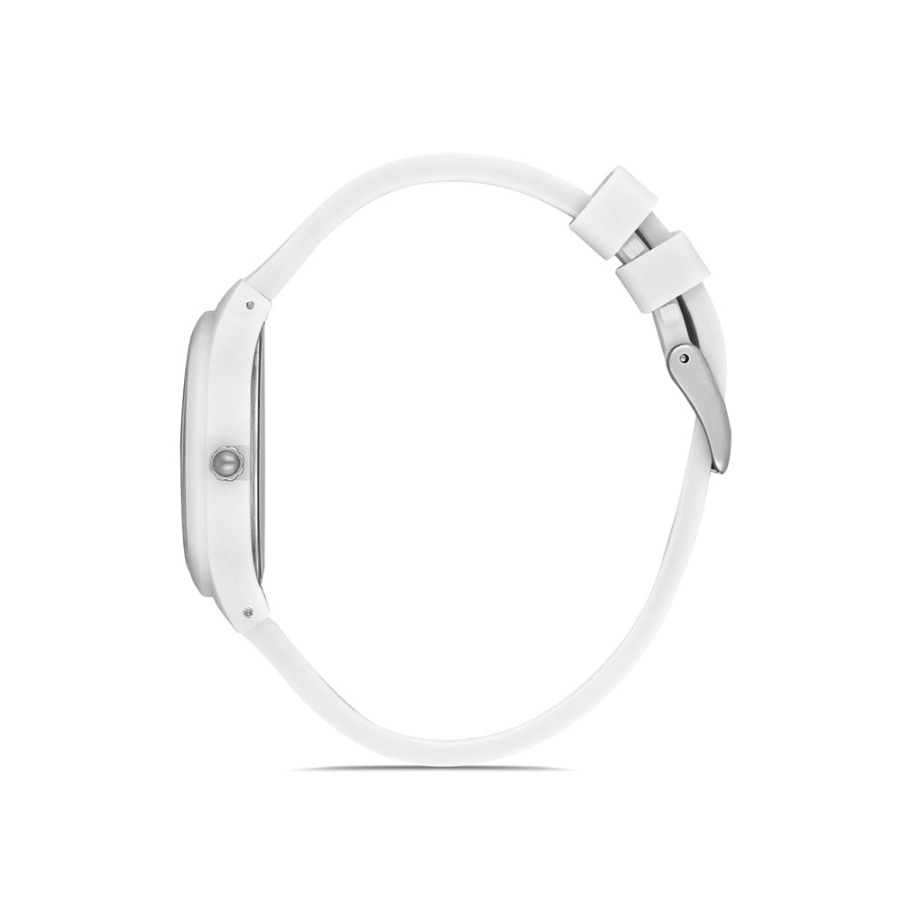 Cadranul argintiu este decorat cu zirconii stralucitoare, adaugand un plus de rafinament si eleganta. Forma rotunda a carcasei de 34 mm din plastic alb confera un aspect modern si usor de asortat la orice tinuta.