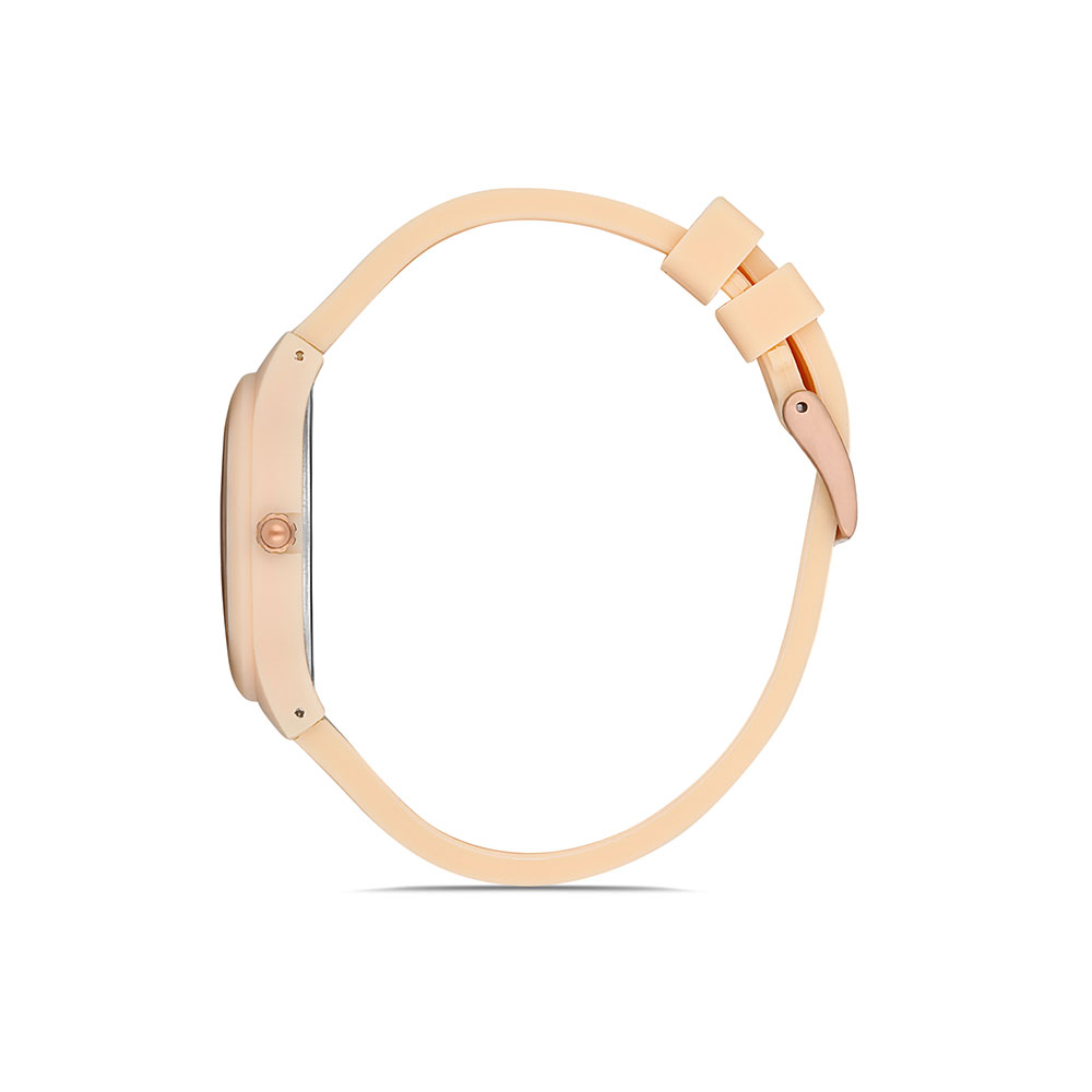 Cadranul de culoare auriu rose este decorat cu zirconii stralucitoare, oferind un aspect luxos si sofisticat. Conturul rotund al carcasei, realizata din plastic in nuanta piersica, adauga un plus de delicatete si unicitate.