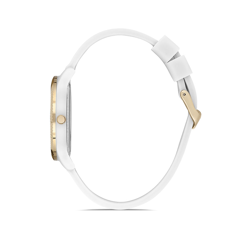 Carcasa rotunda de 38 mm, realizata din plastic alb, este completata de un bezel decorativ auriu care adauga un plus de sofisticare. Cadranul argintiu, cu marcaje si indicatoare aurii, ofera un contrast elegant si o lizibilitate excelenta.
