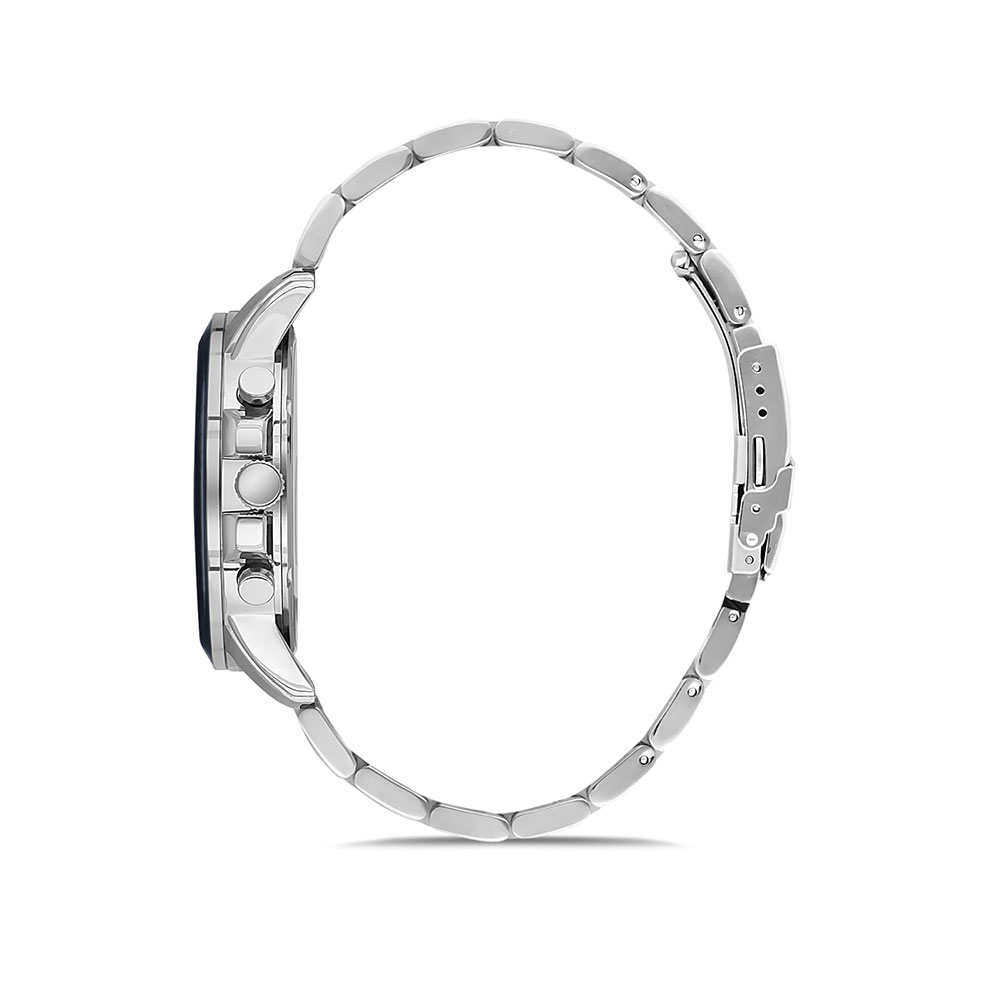 Indicatoare luminoase; carcasa argintie, cu bezel decorativ negru; bratara tip zale, in doua tonuri, argintiu mat si lucios, cu inchizatoare tip fluture; afiseaza data si ziua curente si ora in format 12/24; functie dual time, afiseaza doua fuse orare diferite.