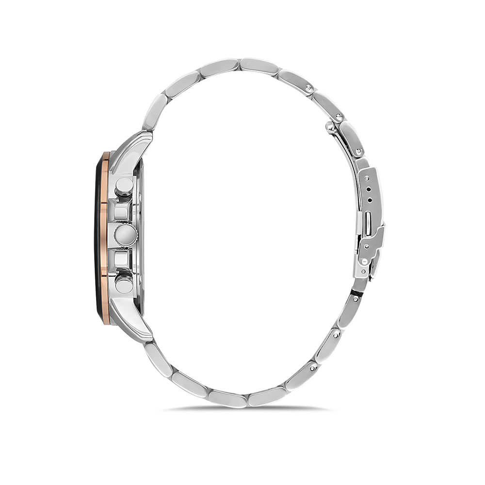 Indicatoare luminoase; carcasa argintie, cu bezel decorativ bicolor; bratara tip zale, in doua culori, argintiu si auriu rose, cu inchizatoare tip fluture; afiseaza data si ziua curente si ora in format 12/24; functie dual time, afiseaza doua fuse orare diferite.