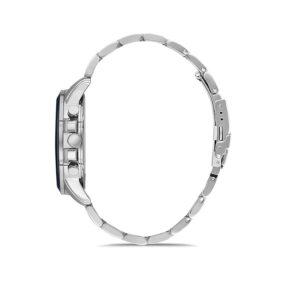 Indicatoare luminoase; carcasa argintie, cu bezel decorativ bleumarin; bratara tip zale, in doua tonuri, argintiu mat si lucios, cu inchizatoare tip fluture; afiseaza data si ziua curente si ora in format 12/24; functie dual time, afiseaza doua fuse orare diferite.