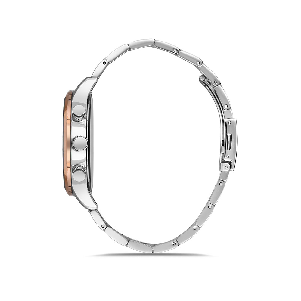 Indicatoare luminoase; carcasa argintie cu bezel decorativ auriu rose; bratara tip zale, in doua culori, argintiu si auriu rose, cu inchizatoare tip fluture, avand lungimea utila 20 cm si latimea de 2,2 cm; afiseaza data si ziua curente si ora in format 1