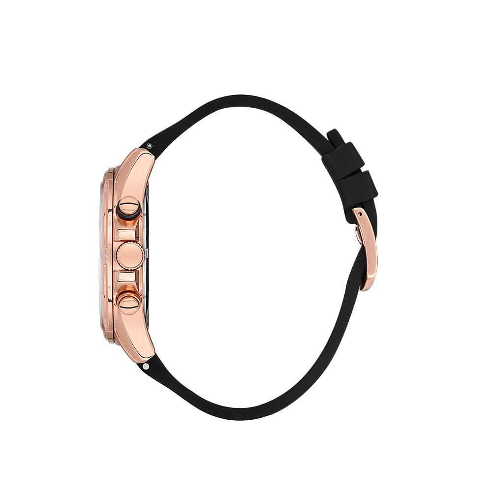 Carcasa auriu rose din aliaj metalic adauga un plus de sofisticare, in timp ce cadranul negru cu afisaj analogic si marcaje luminoase ofera vizibilitate excelenta in orice conditii. Geamul din cristal mineral protejeaza impotriva zgarieturilor, asigurand durabilitate pe termen lung.