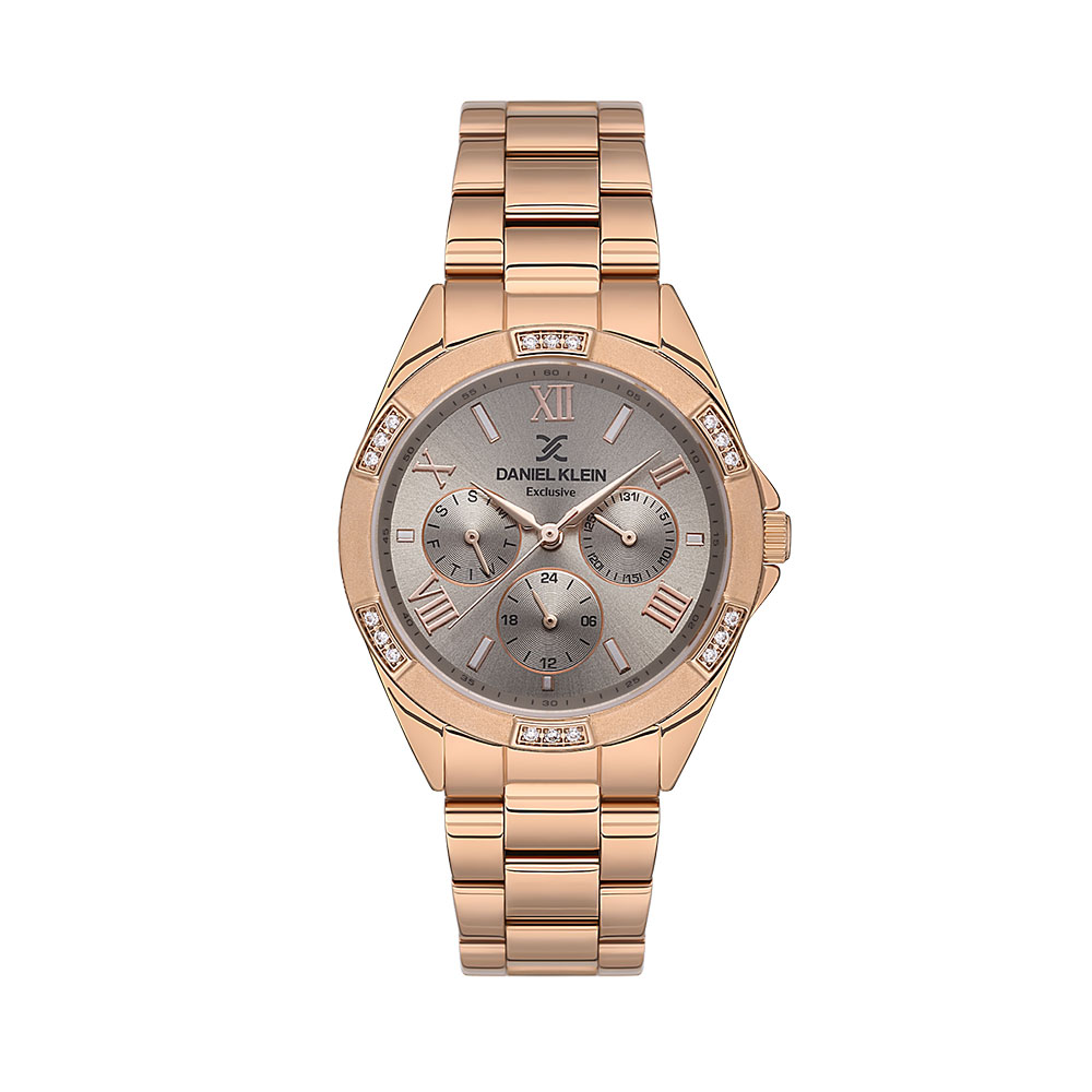 Carcasa rotunda din aliaj metalic, cu un diametru de 36 mm si finisaj auriu rose, este completata de un cadran argintiu cu detalii fine. Indicatoarele si cifrele romane ofera un aspect clasic, iar cele trei subcadrane adauga un plus de utilitate, afisand data, ziua saptamanii si formatul orar 12/24.