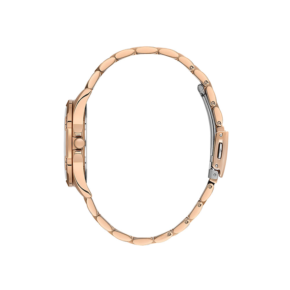 Bratara eleganta din otel inoxidabil auriu rose confera durabilitate si confort, fiind prevazuta cu un sistem de inchidere tip fluture pentru o fixare sigura. Mecanismul Quartz japonez Epson Vx3je1 asigura precizie si fiabilitate, avand o abatere de doar ±20 secunde pe luna.