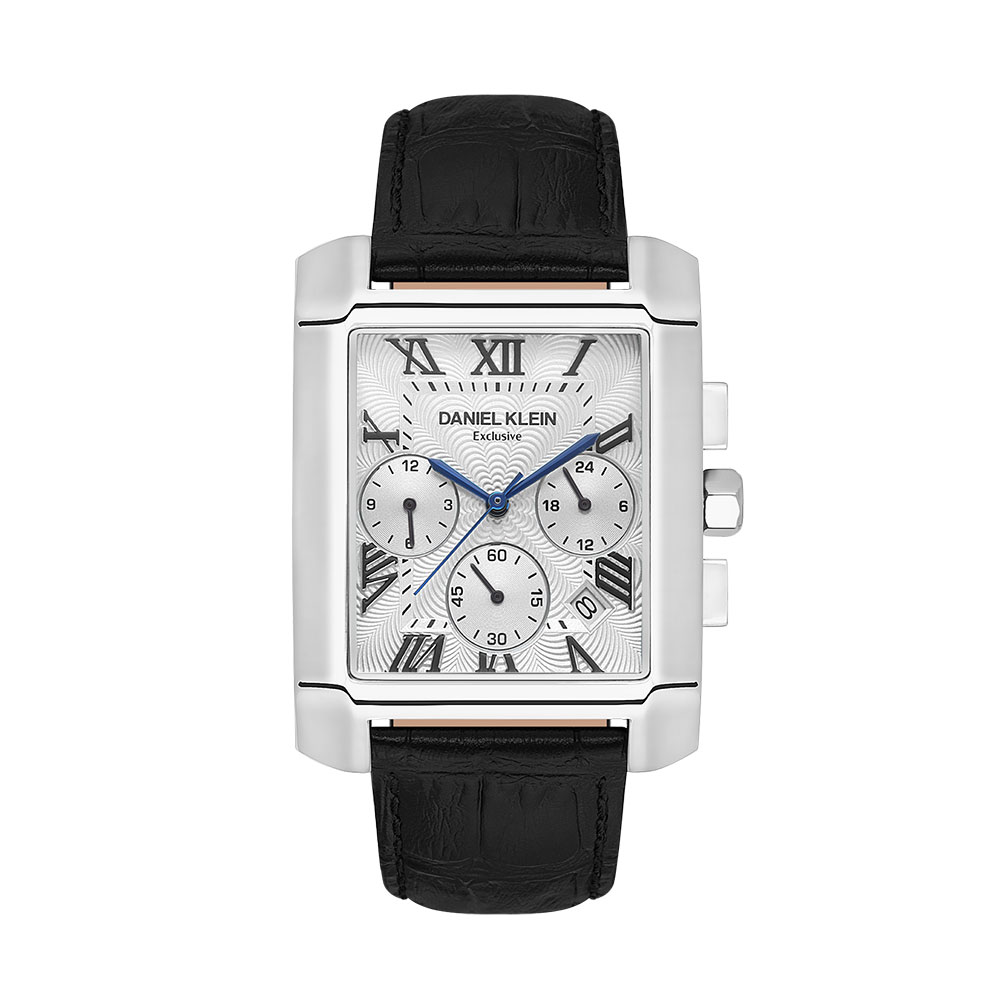 Cu o carcasa dreptunghiulara din aliaj metalic de culoare argintie, acest ceas atrage atentia prin liniile sale fine si detaliile bine definite. Cadranul alb-argintiu este decorat cu cifre romane si trei subcadrane functionale, oferind un aspect sofisticat si usor de citit.
