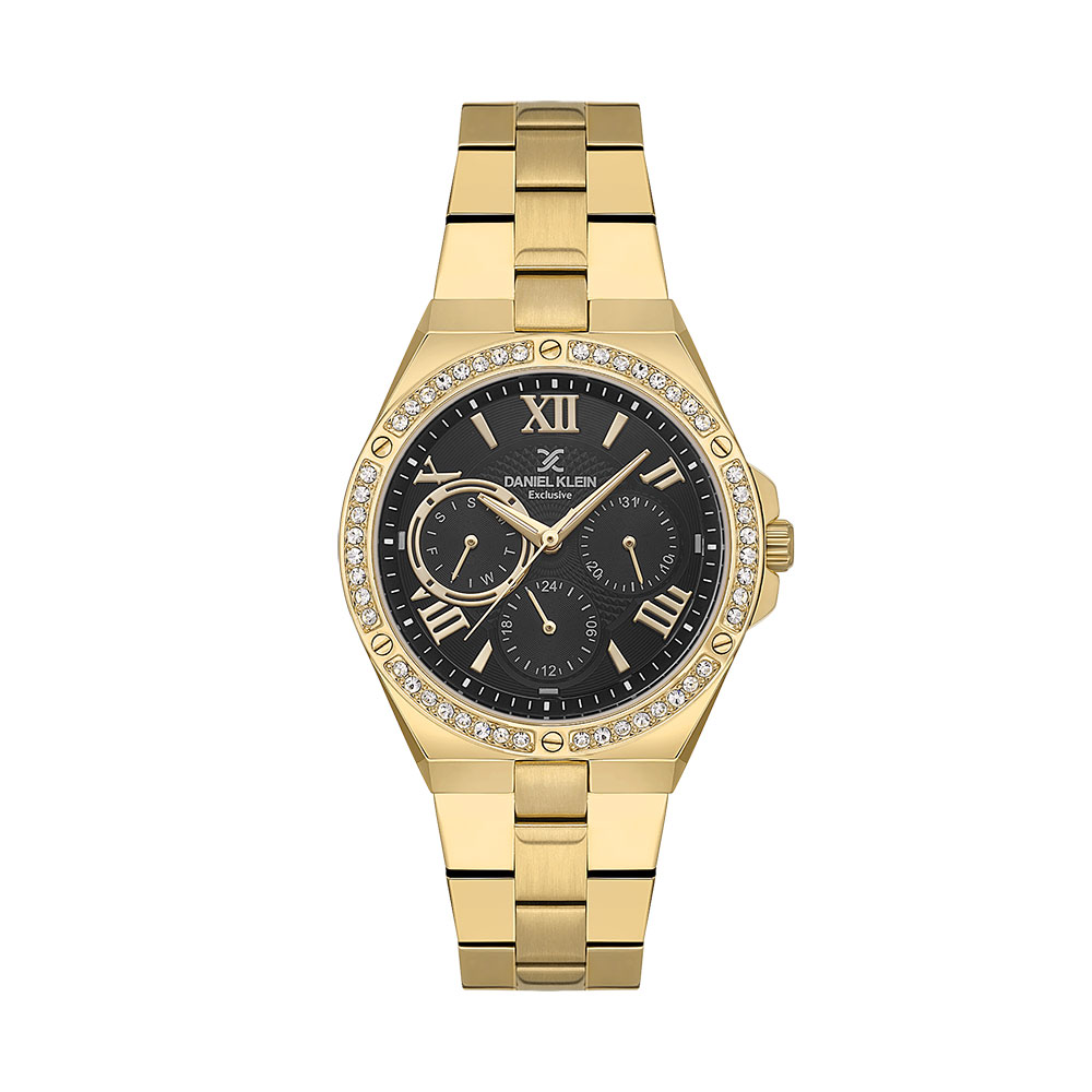 Colectia Exclusive de la Daniel Klein se distinge prin designul sofisticat si atentia la detalii. Cadranul negru contrastant, impreuna cu carcasa aurie si detaliile stralucitoare pe margine, ofera un aspect luxos si atragator.