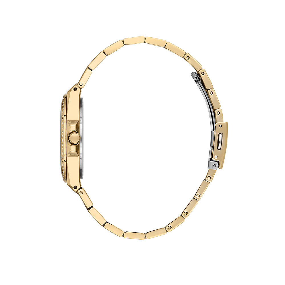 - Bratara din otel inoxidabil in culoare aurie este completata de un sistem de inchidere tip fluture, care adauga un plus de securitate si confort.