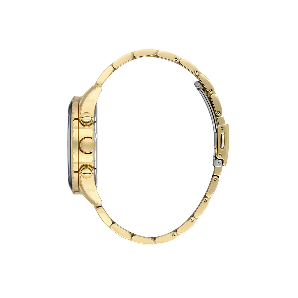 Cu un mecanism quartz japonez de inalta precizie, acest ceas garanteaza o abatere de doar ± 20 secunde pe luna. Afisajul analogic pe un cadran negru sofisticat, protejat de un geam din cristal mineral, ofera o vizibilitate clara si un aspect deosebit. Carcasa rotunda, de 44 mm, din aliaj metalic auriu, adauga un plus de eleganta si rezistenta.