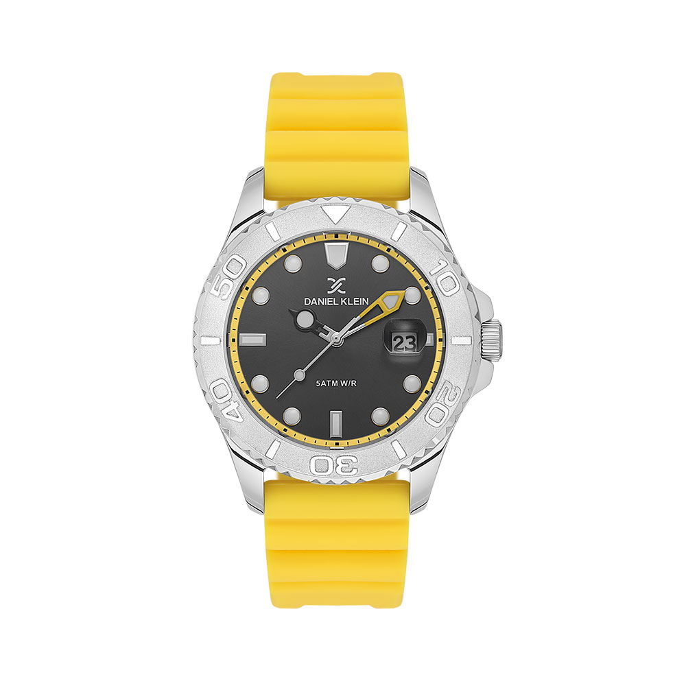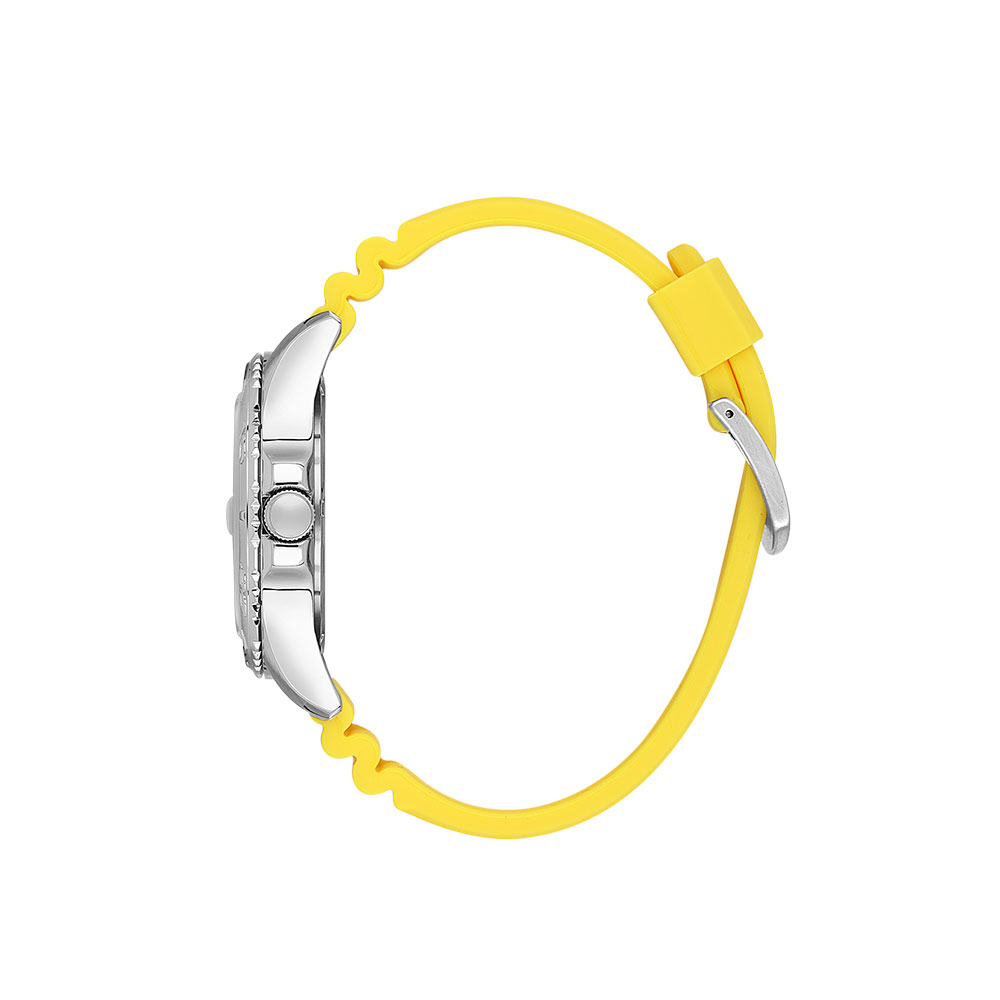 - Afisaj analogic clar, cu o curea de silicon galben vibranta si carcasa de aliaj metalic argintiu